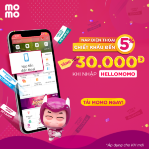 Nhập mã HELLOMOMO: Chiết khấu 5% và tặng thẻ nạp 30.000đ cho khách hàng mới liên kết Momo