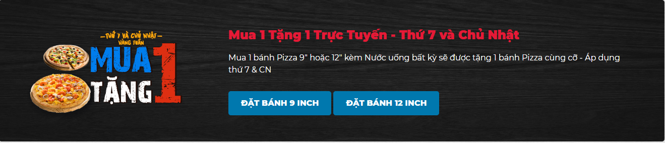 Cuối tuần mà phân vân ăn gì thì nhớ đến Domino’s pizza. Đang có chương trình mua 1 bánh Pizza 9″ hoặc 12″ kèm Nước uống bất kỳ sẽ được tặng 1 bánh Pizza cùng cỡ. Áp dụng cho cuối tuần, thứ 7 & chủ nhật cho hóa đơn từ 100.000đ