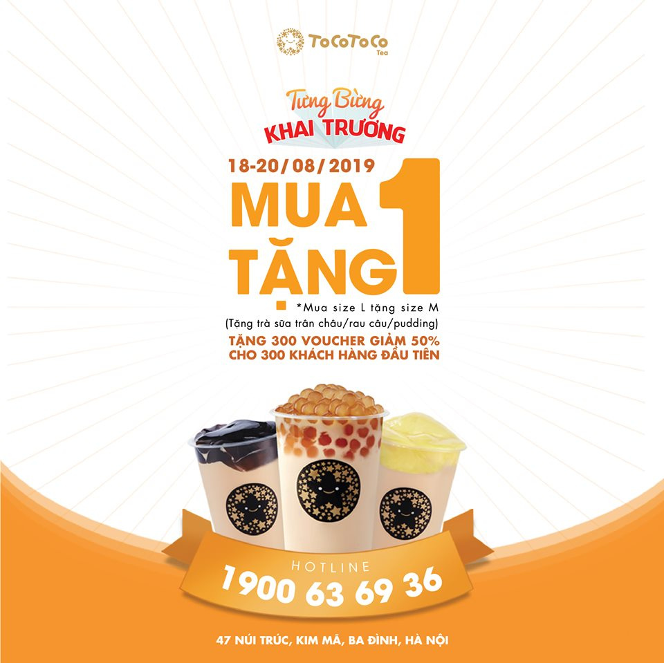 Mua một tặng một: Mua 1 ly size L nguyên giá bất kỳ tặng 1 ly size M (Sản phẩm tặng: Trà sữa trân châu hoàng gia, Trà sữa rau câu, Trà sữa pudding) – Áp dụng: 17/08 – 19/08/2019. tại 96 Kim Giang và 18/08 – 20/08 tại 47 Núi Trúc