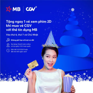 MB dành tặng bạn 1 vé xem phim 2D CGV với mỗi giao dịch mua vé và thanh toán bằng thẻ tín dụng MB Visa hoặc MB JCB