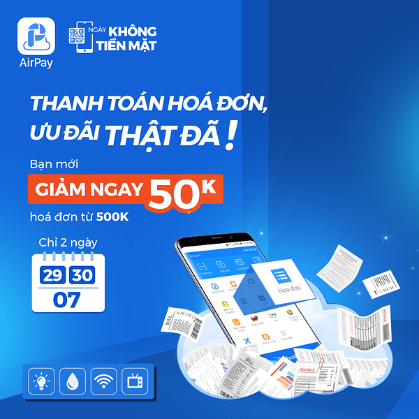 - Ưu đãi cho Khách hàng mới của Ví AirPay khi thanh toán hóa đơn điện, nước, TH cáp và Internet lần đầu: Giảm ngay 50.000đ cho hóa đơn từ 500.000đ