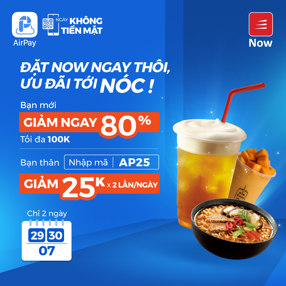 - Ưu đãi dành cho khách hàng mới (chưa từng thanh toán đơn hàng Now qua Ví AirPay): Mã giảm 80%, tối đa 100.000đ có sẵn trong “Ví voucher” của tài khoản Now của khách hàng