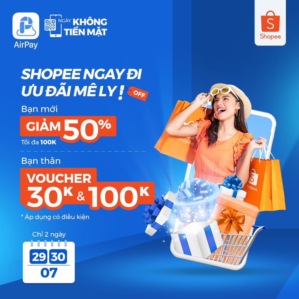 - Ưu đãi dành cho khách hàng mới (chưa từng thanh toán đơn hàng Shopee qua Ví AirPay): Mã giảm giá 50%, tối đa 100.000đ có sẵn trong “Ví voucher” của tài khoản Shopee của khách hàng