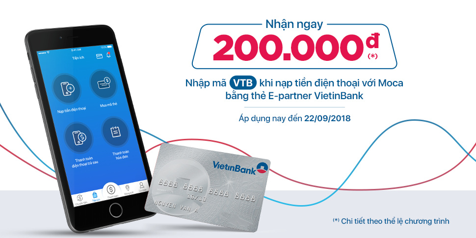 Từ ngày 09/8/2018 đến 22/9/2018, Khách hàng liên kết thẻ VietinBank E-partner với Ứng dụng Moca và nhập mã quà tặng “VTB” khi thực hiện giao dịch nạp tiền điện thoại và thanh toán hàng hóa dịch vụ sẽ được tặng ngay số tiền bằng giá trị thanh toán (tối đa 100.000 đồng) vào tài khoản ví Moca của mình.