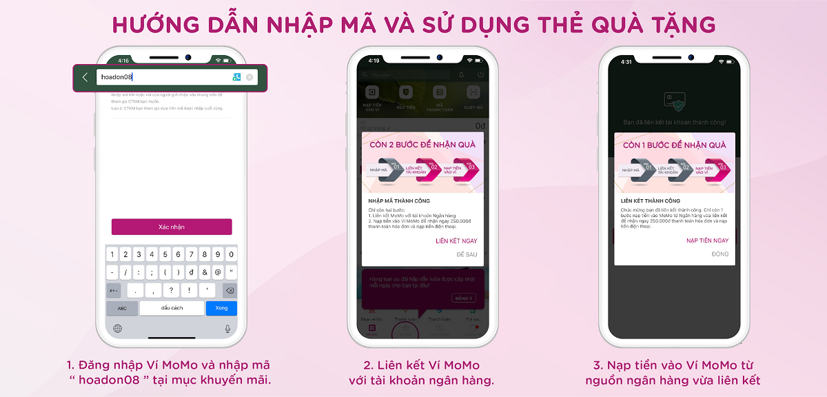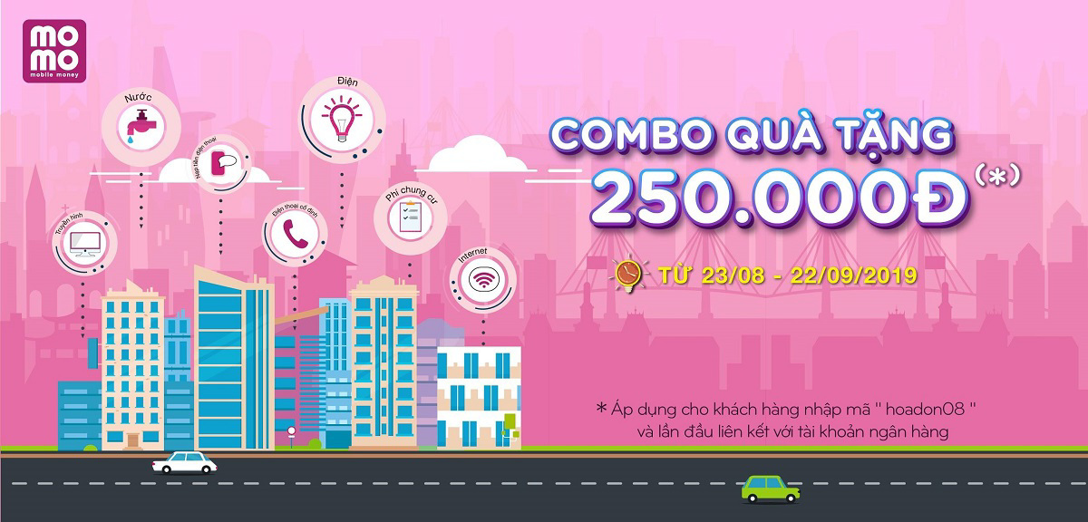 Từ nay đến ngày 22/11/2019, khi nhập mã “hoadon08” và liên kết ngân hàng với MoMo, bạn sẽ nhận ngay gói quà tặng giá trị 250.000 đồng để sử dụng các dịch vụ thanh toán hóa đơn trên Ví MoMo.