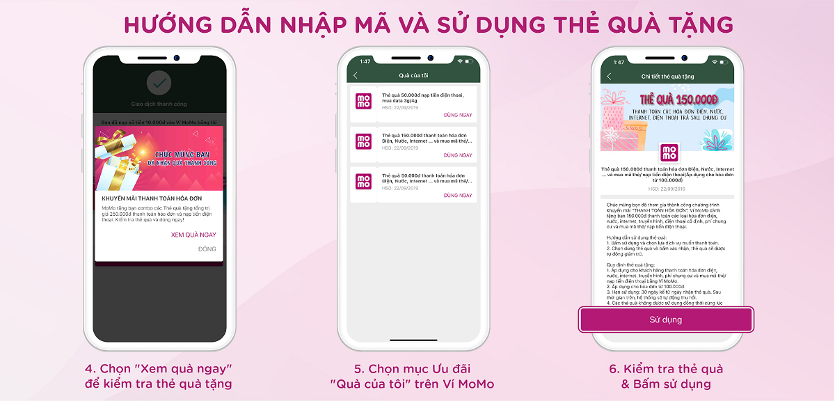 - 01 thẻ quà trị giá 150.000đ (áp dụng cho hóa đơn từ 100.000đ) thanh toán hóa đơn (điện, nước, internet, truyền hình, phí chung cư, điện thoại cố định) và mua mã thẻ/ nạp tiền điện thoại các nhà mạng.