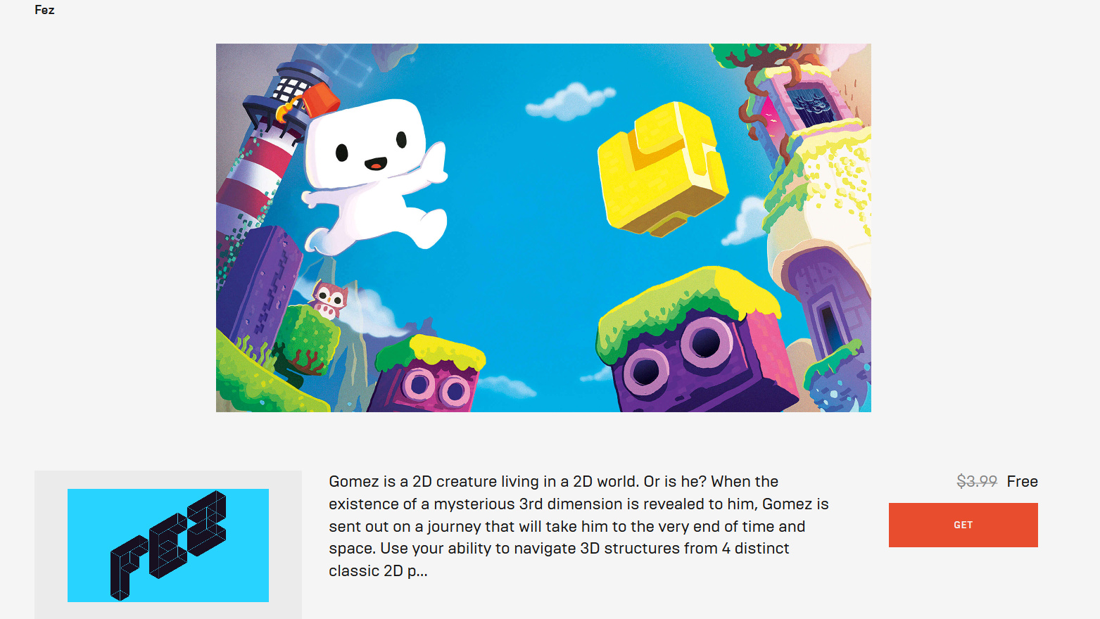 Game miễn phí mà Epic Games Store give away trong tuần này là Fez, game 2D có lối chơi thú vị, cho phép người chơi xoay chuyển 4 góc nhìn 2D của vật thể 3D trong game để vượt qua các màn chơi. Fez được đánh giá rất cao bởi người chơi trên Steam, với 92% trong số 8,033 người chơi đã đánh giá tốt về game.