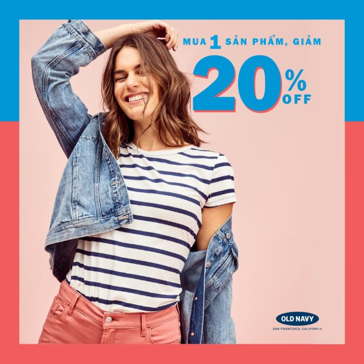 Old Navy giảm 20% khi mua 1 sản phẩm, 30% khi mua 2 sản phẩm cho nữ và bé gái.