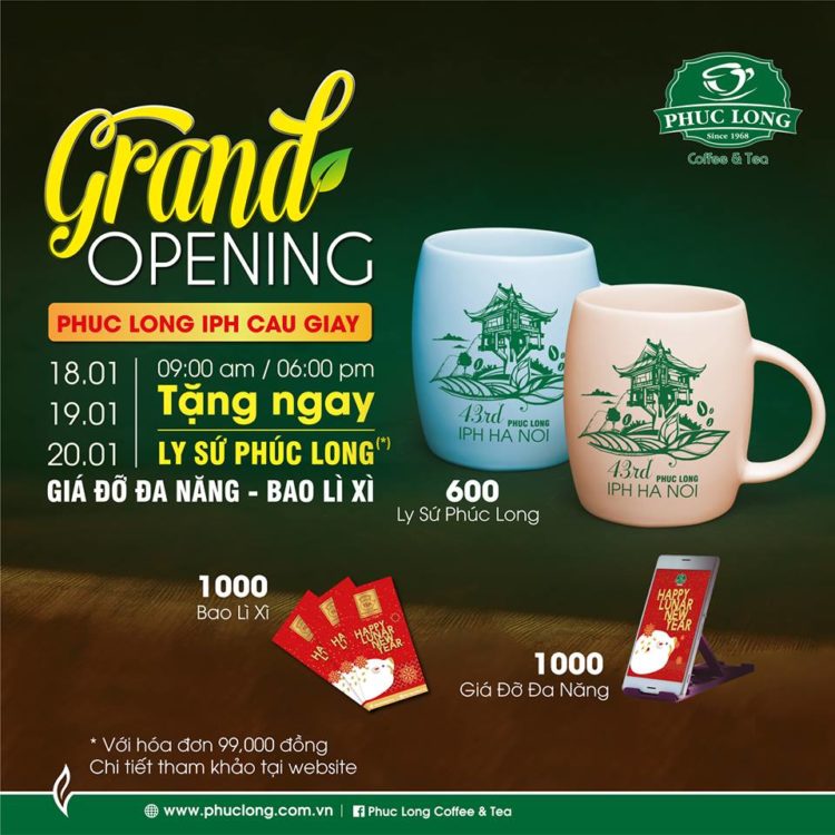 Ngày 18, 19 và 20.01.2019, cùng tham dự sự kiện khai trương cửa hàng Phúc Long IPH – Cầu Giấy và nhận: