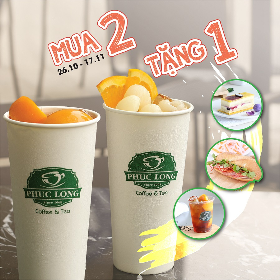 Ưu đãi cho khách hách hàng đến cửa hàng Phúc Long mua 02 thức uống size Lớn bất kỳ sẽ được tặng 01 thức uống size Vừa bất kỳ hoặc 01 bánh mì/bánh lạnh bất kỳ.