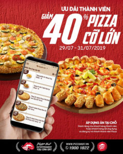 Từ 29-31/07/2019, Pizza Hut GIẢM ngay 40% Pizza cỡ lớn cho tất cả khách hàng thành viên hoặc khách hàng tải ứng dụng và đăng ký trở thành thành viên Pizza Hut.