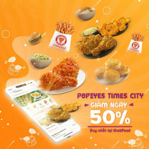 Popeyes giảm giá 50% menu các món lẻ khi đặt qua Grabfood hoặc mua tại Popeyes Times City.