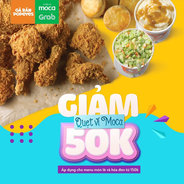 Người dùng khi thanh toán hóa đơn từ 150K tại Popeyes với ví Moca sẽ được giảm 50K.