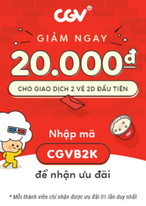 Đăng ký thành viên mới CGV & nhập mã giảm giá CGVB2K để được giảm 20K cho giao dịch 02 vé 2D bất kỳ.