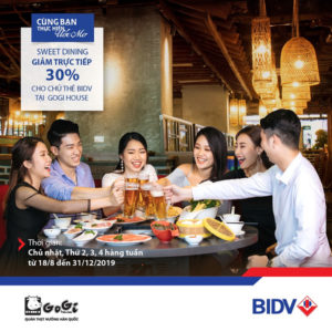 Chỉ cần có trong tay chiếc thẻ ngân hàng BIDV, Team nướng nhận ngay ưu đãi 30% trên tổng giá trị hóa đơn khi thanh toán bằng thẻ BIDV cho các dịch vụ tại GoGi House