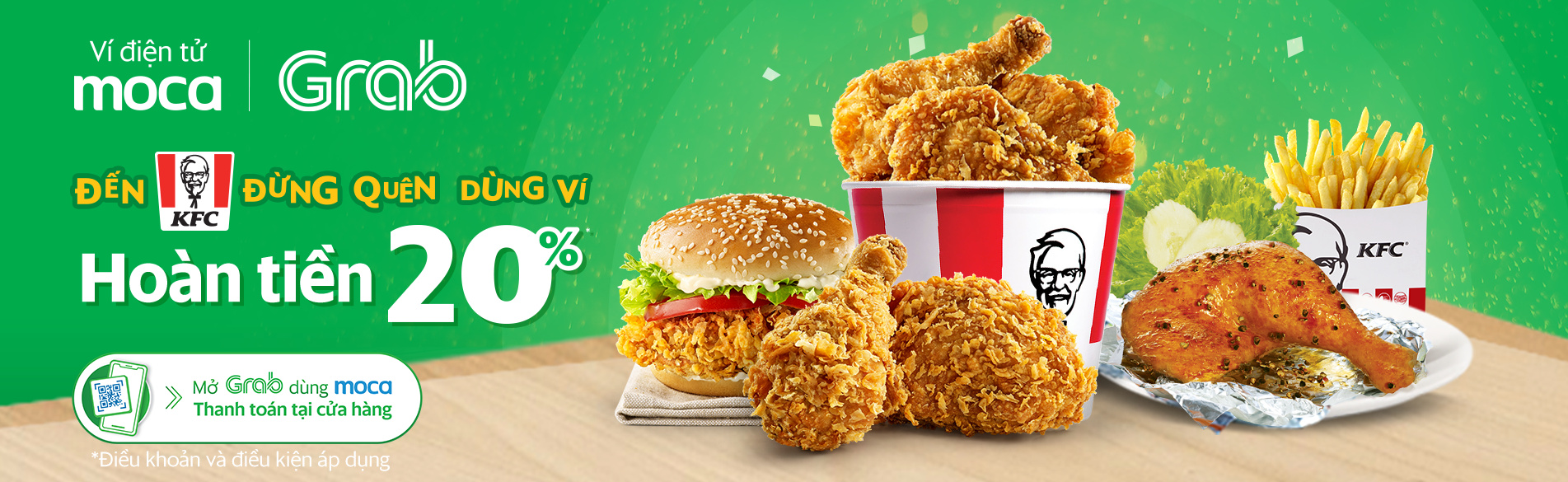 Từ nay đến hết 15/12/2019, khi thanh toán tại chuỗi cửa hàng KFC qua Ví điện tử Moca trên ứng dụng Grab, bạn được HOÀN TIỀN NGAY 20% (tối đa 20.000đ) vào Ví.