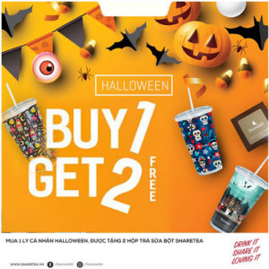Tặng 01 hộp trà sữa uống liền cho mỗi hóa đơn từ 100k trở lên tại hệ thống Sharetea trên toàn quốc cho đêm Halloween (cả ngày 30/10 – 31/10)