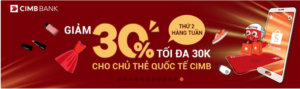 - Giảm 30% tối đa 30K khi thanh toán bằng thẻ quốc tế CIMB có đầu thẻ 403950