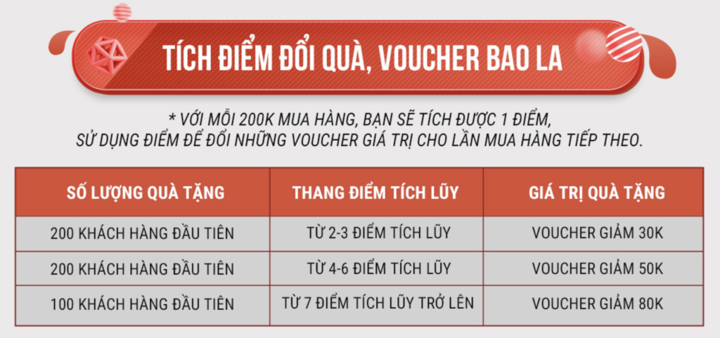 Tích điểm khi mua hàng. Các điểm tích được sẽ đổi thành voucher có giá trị tối đa 80K khi mua hàng.