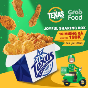 Set Joyful Sharing Box (gồm 10 miếng gà) qua Grabfood giảm còn 199k (giá gốc: 295k).