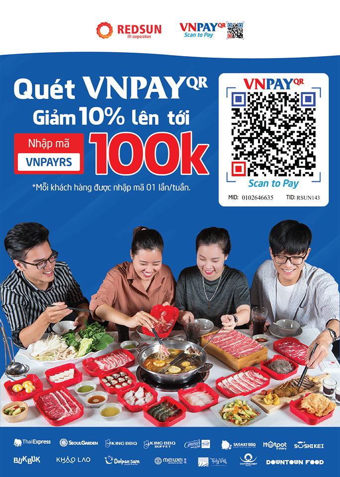 Top thương hiệu nhà hàng nổi tiếng của Red Sun bao gồm: Hotpot Story, Khao Lao, Sushi Kei, Seoul Garden, King BBQ, Tasaki BBQ, Buk Buk, Dolpan Sam, Thai Express,… đang có ưu đãi giảm 10% tối đa 100k khi thanh toán qua VN Pay QR.
