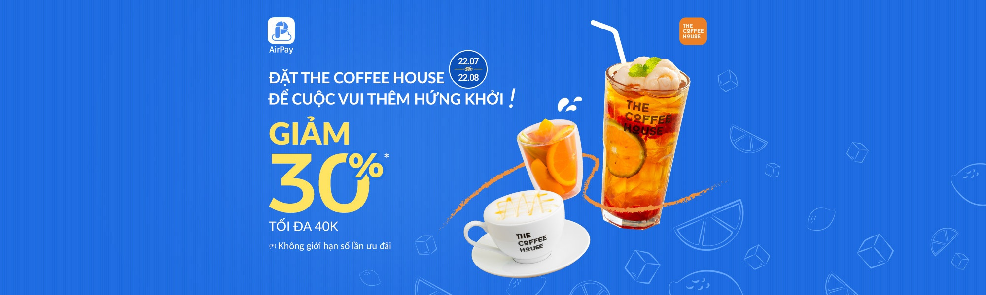 Từ 22/07/2019 đến 22/08/2019, The Coffee House X AirPay trở lại với khuyến mãi 30% tối đa 40K khi thanh toán đơn hàng The Coffee House bằng ví điện tử AirPay, đặc biệt mỗi khách hàng được hưởng ưu đãi không giới hạn số lần trong suốt thời gian khuyến mãi.