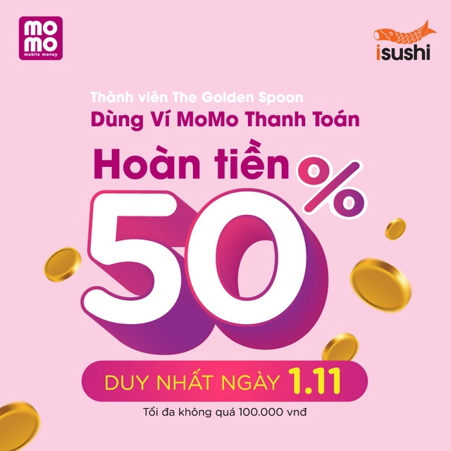 Chương trình khuyến mãi hoàn tiền tới 50% tổng hoá đơn thanh toán khi thanh toán bằng ví Momo với các quán ăn thuộc chuỗi cửa hàng isushi
