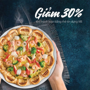 The Pizza Company Giảm 30% tối đa 500k trên tổng hóa đơn vào thứ 4, thứ 5 và thứ 6 hàng tuần. Áp dụng cho dùng bữa tại nhà hàng hoặc mua mang về khi thanh toán qua thẻ tín dụng VIB