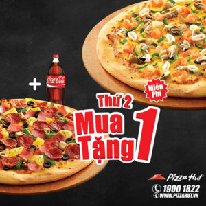 Pizza Hut áp dụng ưu đãi mua 1 tặng 1 vào thứ 2 với các loại pizza cỡ vừa và lớn. Ưu đãi áp dụng với tất cả loại pizza trên menu. Ngoài ra, khi bạn dùng bữa ngay tại nhà hàng thì bạn sẽ được tặng thêm 1 chai nước ngọt 1,5 lít khi mua pizza cỡ lớn và 1 lon nước ngọt 330ml khi mua pizza cỡ vừa. Ưu đãi này sẽ được áp dụng vào thứ 2 các tuần ngoại trừ các ngày lễ và ngày Tết.