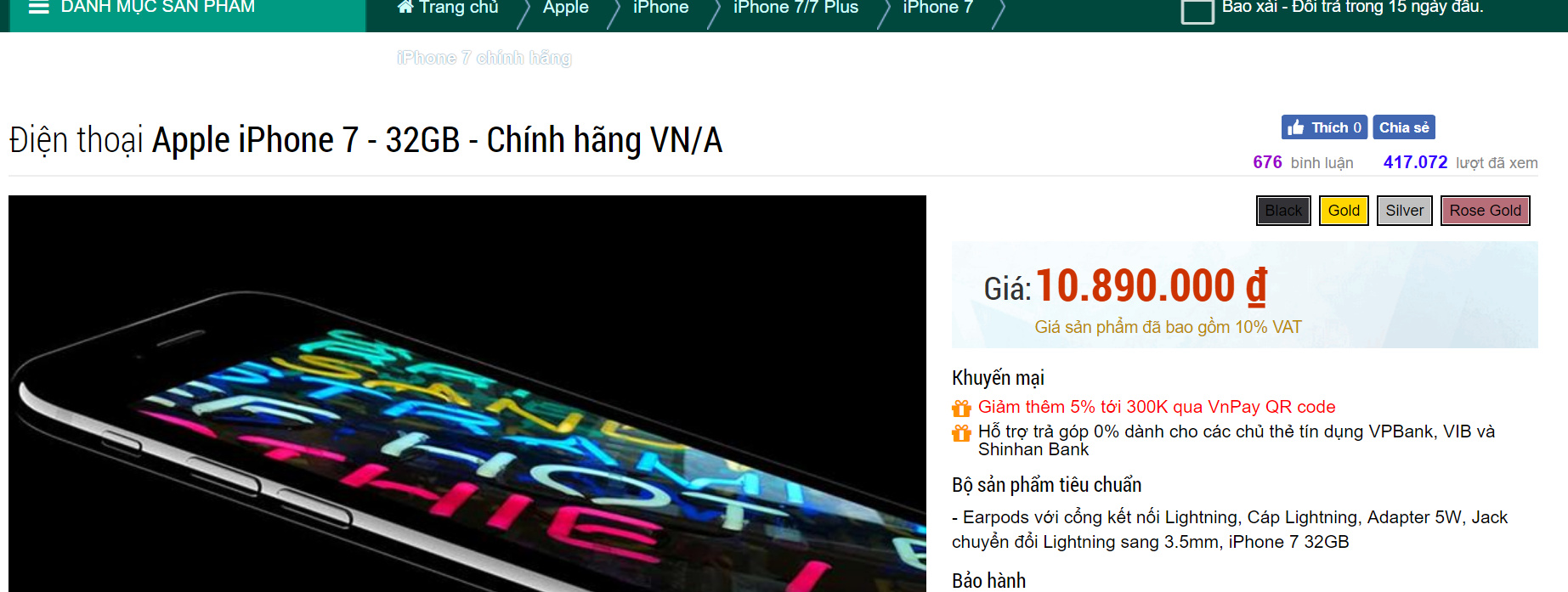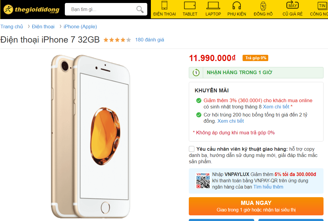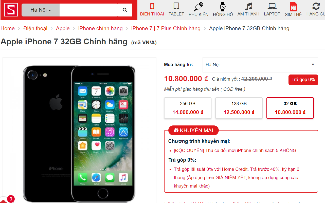 Với một chiếc Iphone 7 32GB bản chính hãng được sản xuất tại Việt Nam, sản phẩm này đang được bán trên Tiki với mức giá 9.990.000đ, một mức giá mềm hơn so với những trang thương mại điện tử khác.