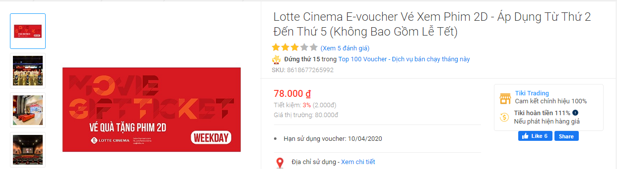 3, Voucher vé xem phim Lotte trên Tiki áp dụng từ thứ 2 đến thứ 5 (không bao gồm ngày lễ). Link mua>>