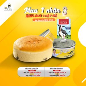 – Khi mua 01 bánh size nhỏ, nhận ngay: 01 Hộp sữa OWN hoặc 01 Hộp Cá Ngừ hiệu Vua Biển