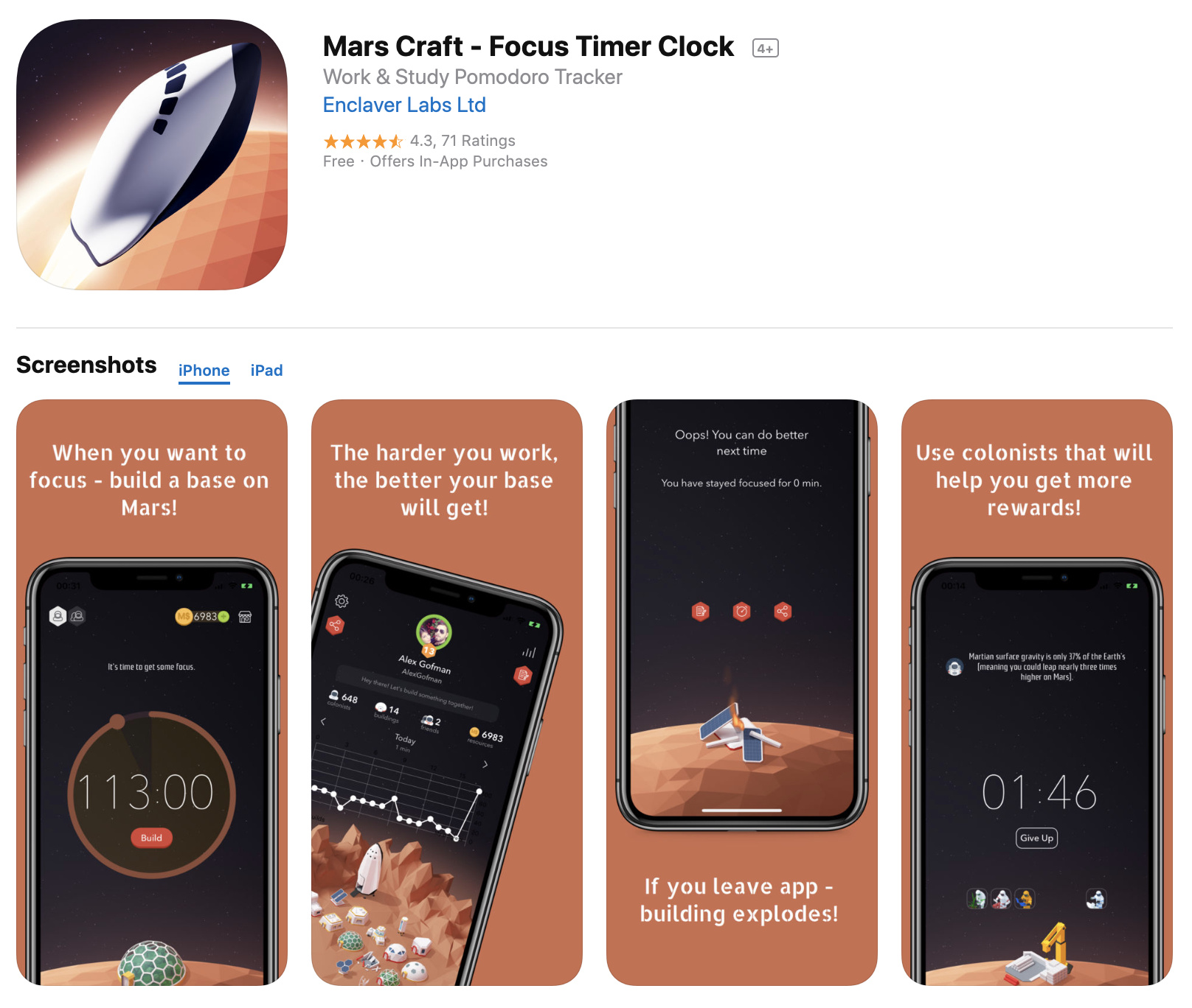 Sử dụng app này, bạn sẽ xây dựng một căn cứ thuộc địa trên sao Hỏa. Và có thể chiến đáu với căn cứ của bạn bè để xem “ai tập trung tốt hơn?” ngày hôm nay. Bạn càng tập trung là càng có cơ hội dành chiến thắng. Chọn thời gian 10p – 2 tiếng, trong lúc bạn làm việc, các tòa nhà trong app cũng sẽ được xây. Và nếu bạn bị cám dỗ vì việc dùng smartphone mà thoát khỏi app, tòa nhà trên sao hỏa của bạn sẽ sụp hoàn toàn #ERROR!