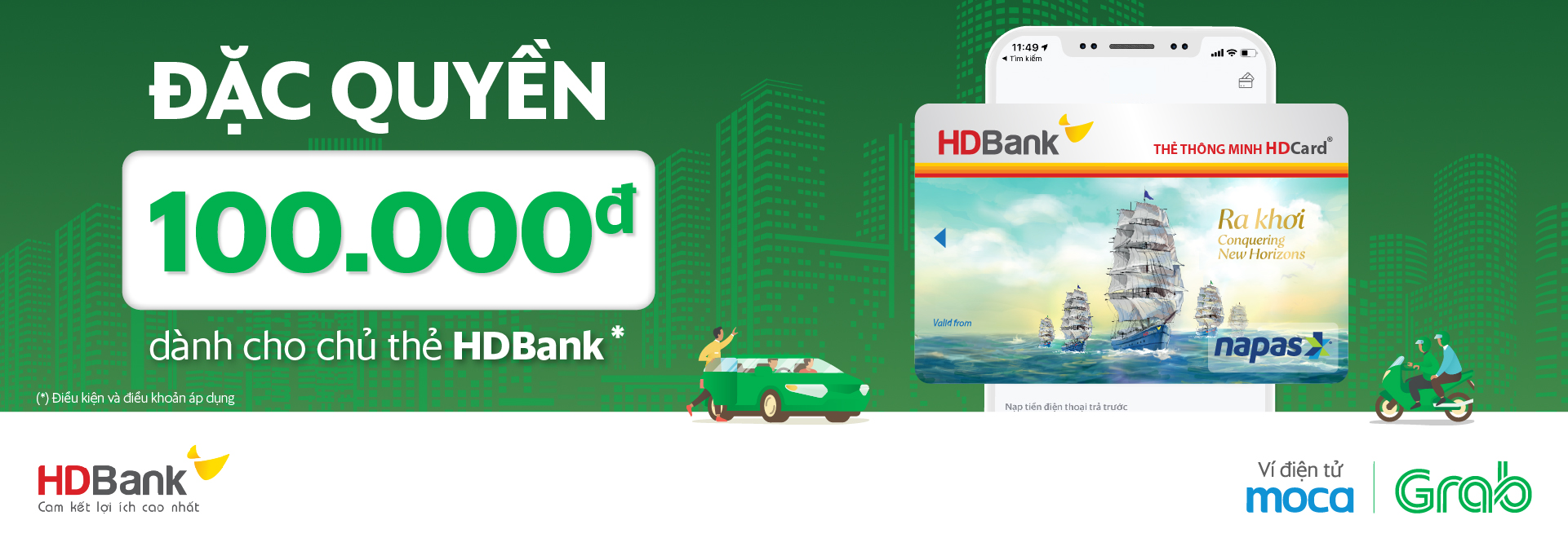 Từ ngày 12/09 đến 25/09/2019, Gran ưu đãi 50Kx 1 chuyến Grab50K x 1 đơn hàng GrabFood khi lần đầu kích hoạt Ví bằng thẻ Ghi nợ nội địa phát hành bởi ngân hàng HDBANK và hoàn thành ít nhất 1 giao dịch nạp tiền từ 100.000đ vào Ví điện tử Moca trên ứng dụng Grab.
