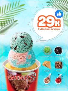 Chỉ với 29K, bạn được thả ga lựa chọn 3 viên kem vị yêu thích của mình. Chương trình kem ngon chào hè vẫn đang áp dụng khắp hệ thống Swensen’s.