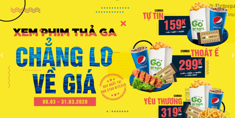 - Combo tự tin chỉ 159K (giá gốc 184K gồm 1 vé, 1 nước, 1 bỏng)