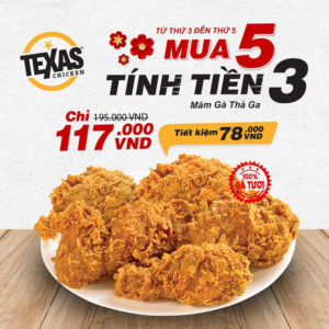 – Chương trình ưu đãi mua 5 tính tiền 3 gà Texas Chicken giá 117k tiết kiệm ngay 78k. Top-up món gà mới Yuzu chỉ với 5.000đ/miếng