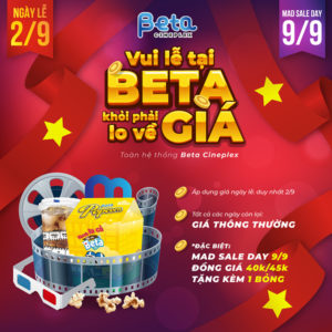 Vì ngày Thứ 2 đầu tiên của tháng 9 năm nay trùng với lịch nghỉ Lễ Quốc Khánh 2/9 và để đảm bảo quyền lợi của khách hàng, Beta Cineplex có Chương trình ưu đãi MAD SALE DAY sẽ chuyển sang ngày 9/9. Theo đó: