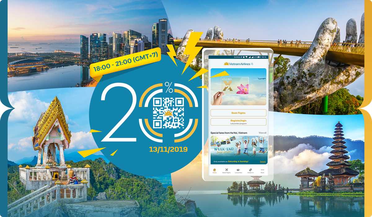 Chỉ trong 3 tiếng đồng hồ, bạn sẽ nhận ngay mã giảm 20% khi mua vé qua App Vietnam Airlines áp dụng cho hành trình 1 chiều hoặc khứ hồi giữa Việt Nam và Thái Lan / Singapore / Malaysia / Indonesia.