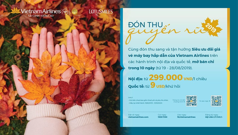 Chỉ trong 10 ngày, bắt đầu từ ngày 19/8 đến hết ngày 28/8/2019, chương trình khuyến mại thường niên lớn nhất năm mang tên “Đón Thu quyến rũ” của Vietnam Airlines sẽ mang đến cho hành khách cơ hội bay toàn cầu trên 90 đường bay và trải nghiệm dịch vụ 4 sao với mức giá đặc biệt hấp dẫn: