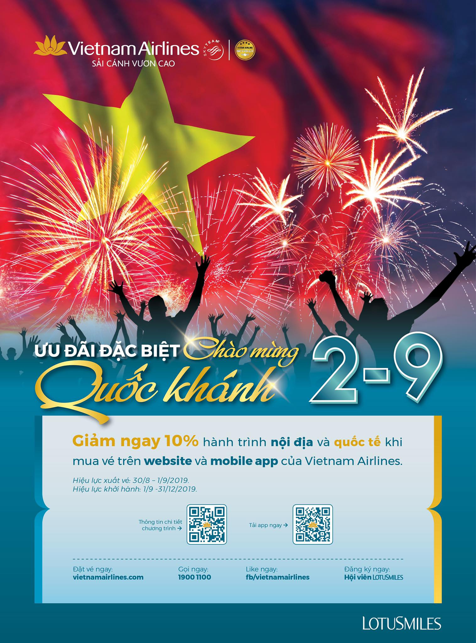 Mừng Quốc khánh 2/9, Vietnam Airlines tặng ngay ưu đãi 10% giá vé trên các đường bay nội địa và quốc tế.