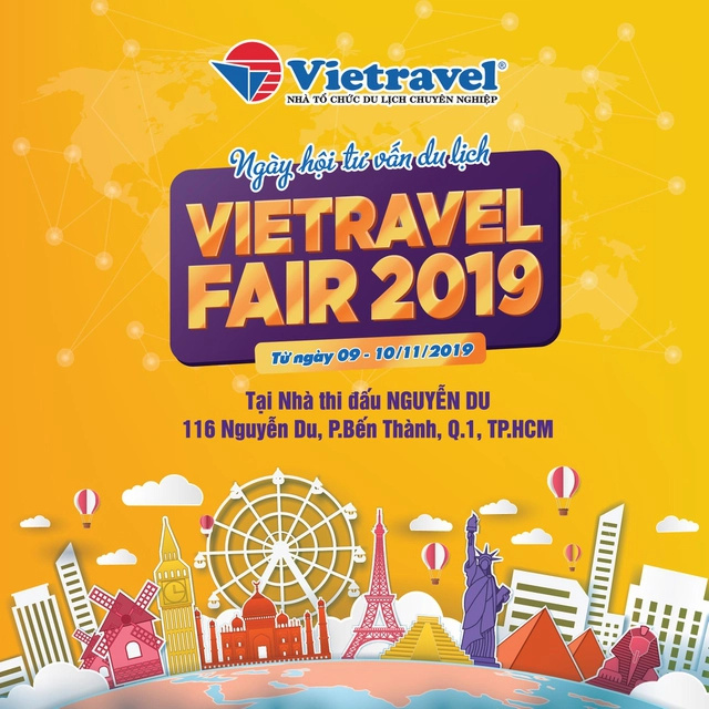 Ngày hội tư vấn du lịch cùng Vietravel Fair 2019 diễn ra trong 2 ngày: 9 &10/11 tại Nhà thi đấu Nguyễn Du (116 Nguyễn Du, P.Bến Thành, Q.1, TP.HCM) đem đến cho bạn nhiều ưu đãi hấp dẫn.