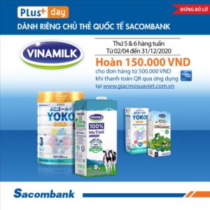 Vinamilk áp dụng ưu đãi hoàn 150K cho đơn từ 500K khi thanh toán QR qua ứng dụng Sacombank Pay bằng thẻ quốc tế Sacombank.