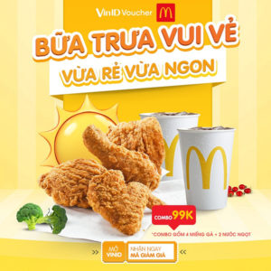 McDonald’s dành tặng khách hàng thân thiết của VinID ưu đãi hấp dẫn chỉ 99.000 đồng cho 4 miếng gà rán và 2 ly nước ngọt.