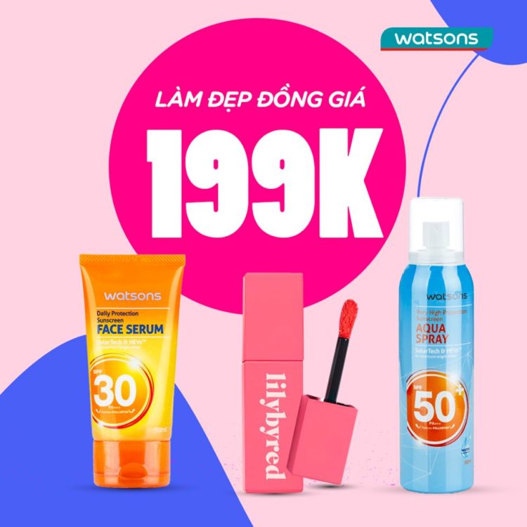 Watsons đồng giá 199K từ những thương hiệu skincare và makeup và freeship đơn từ 249K.