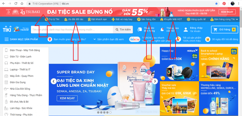 Ở hình trên các bạn có thể thấy nhiều dấu mũi tên đỏ, đó là khu vực treo banner chạy quảng cáo của Tiki.