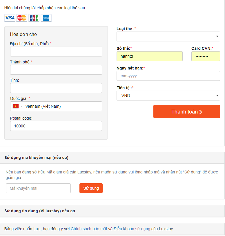 - Sau khi điền thông tin đầy đủ, hãy nhập mã ưu đãi của Luxstay rồi nhấn THANH TOÁN để chuyển sang lựa chọn các hình thức thanh toán.