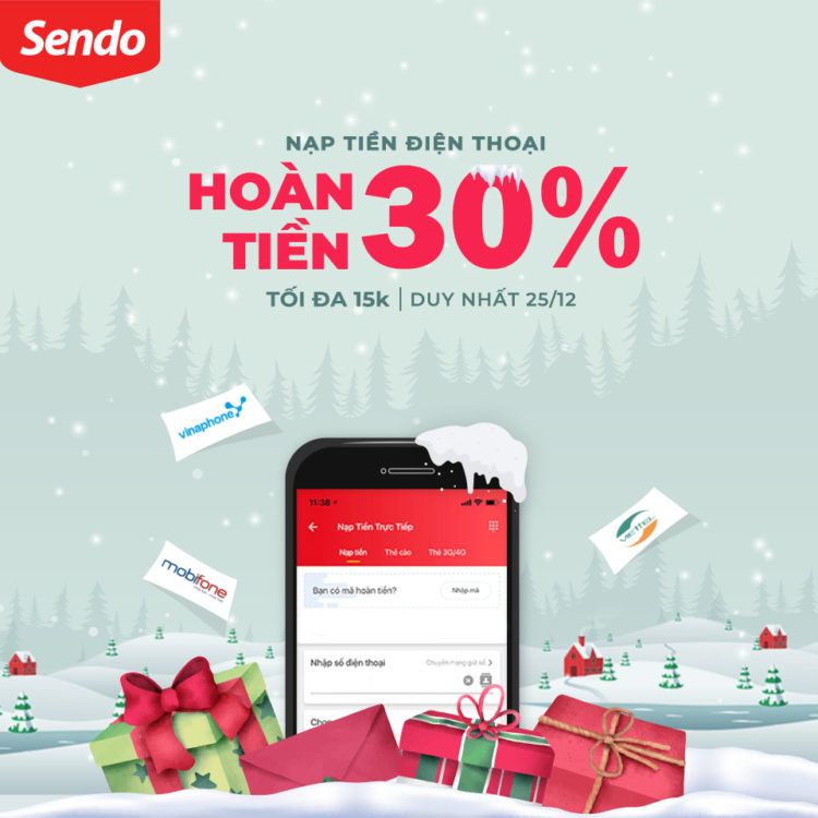 Sendo ưu đãi hoàn tiền 30% chữ in đậm khi nạp thẻ điện thoại trong ngày 25.12.2019