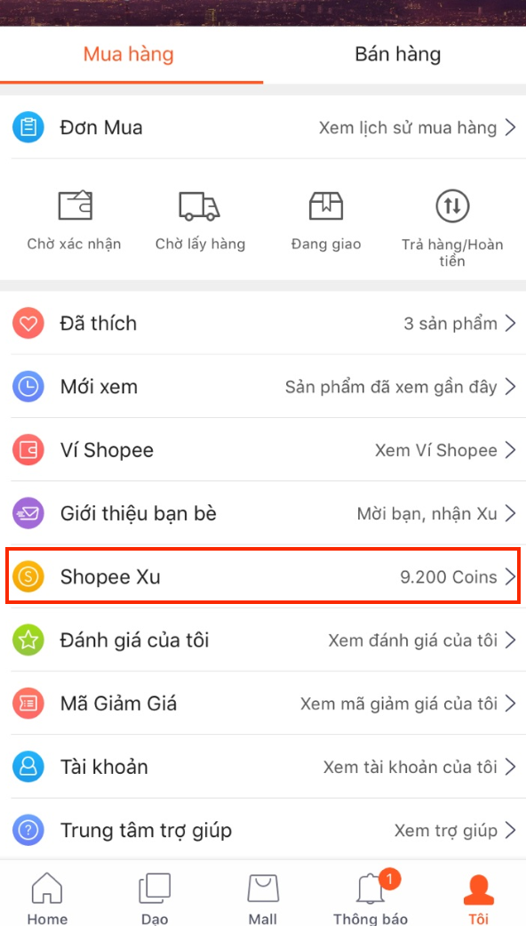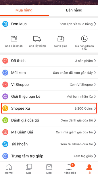• Cách 2: Vào trang Tôi > trang Mua hàng > mục “Shopee Xu”