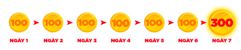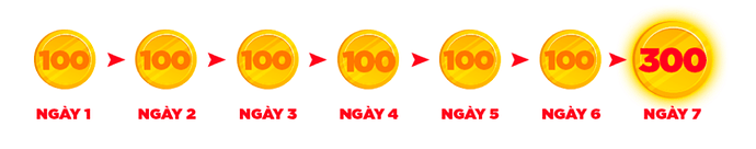 Cụ thể: Đăng nhập mỗi ngày để nhận 100 Xu và đăng nhập 7 ngày liên tiếp để nhận 300 Xu vào ngày thứ 7.